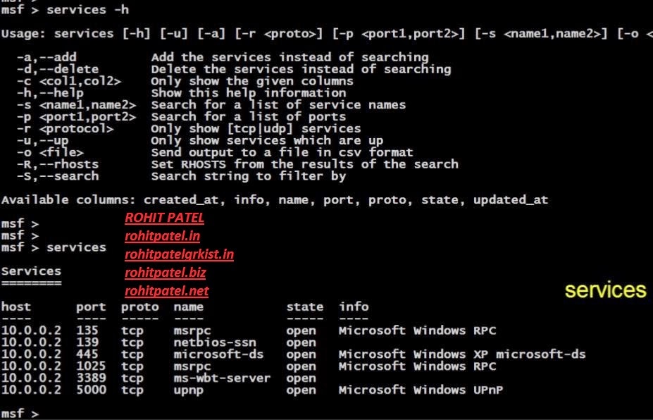 Now to check the services running on the target machine we can use the command tool like "services". As the Scanned Information is stored in the Workspace we created and hence from there we are fetching the Services Running on the Victim Machine.