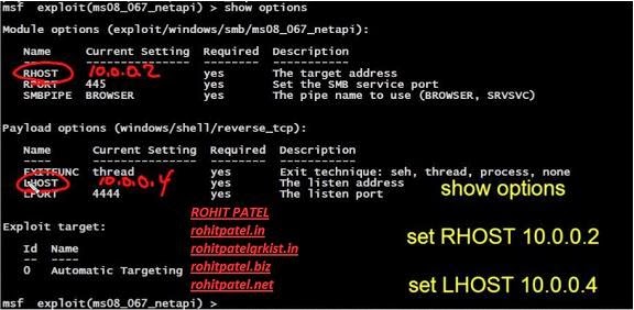 To set the RHOST IP which is 10.0.0.2 we will use the command like "set RHOST 10.0.0.2" and this is the same process for the LHOST which is Backtrack 5 machine "set LHOST 10.0.0.4".